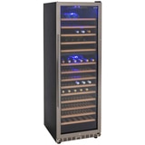 This Euro wine cooler has a double-glazed and UV filtered glass front door with a stainless steel trim and handle. It fits 157 to 164 bottles, features computerised temperature control, and has dual temperature zones, with a 5-12 C upper area and 12-22 C lower area. It has an internal blue LED light, intuitive optimum humidity control, and compressor quiet cooling control. There are 14 telescopic rail and wooden shelves to store your wine, there's no frost, and it can be locked with a key.