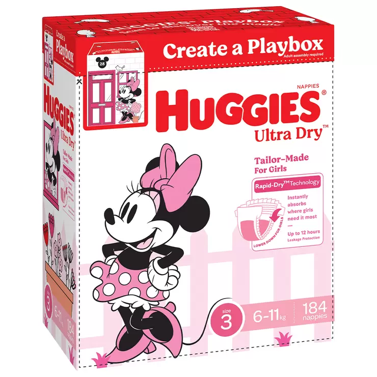 Huggies' girls' Ultra Dry nappies in size 3 crawler (6-11 kg) contain 184 nappies per pack. They provide soft protection for girls, guarding against leaks and red marks. The DryTouch layer helps to absorb wetness and provides up to 12 hours leakage protection. The Huggies' Gentle Absorb layer leaves baby's skin cleaner and drier. Packaging artwork may vary.