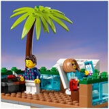 Enjoy the good life at the LEGO City Apartment Building. This place is awesome! It has a convenience store where you can buy essential goods and tasty slushies, a modern living room with a sofa and TV, a well-equipped kitchen, a cozy bedroom and a bathroom with a toilet and bathtub. There’s even an outdoor pool and a rooftop terrace with a barbecue and palm tree. Let’s go!
