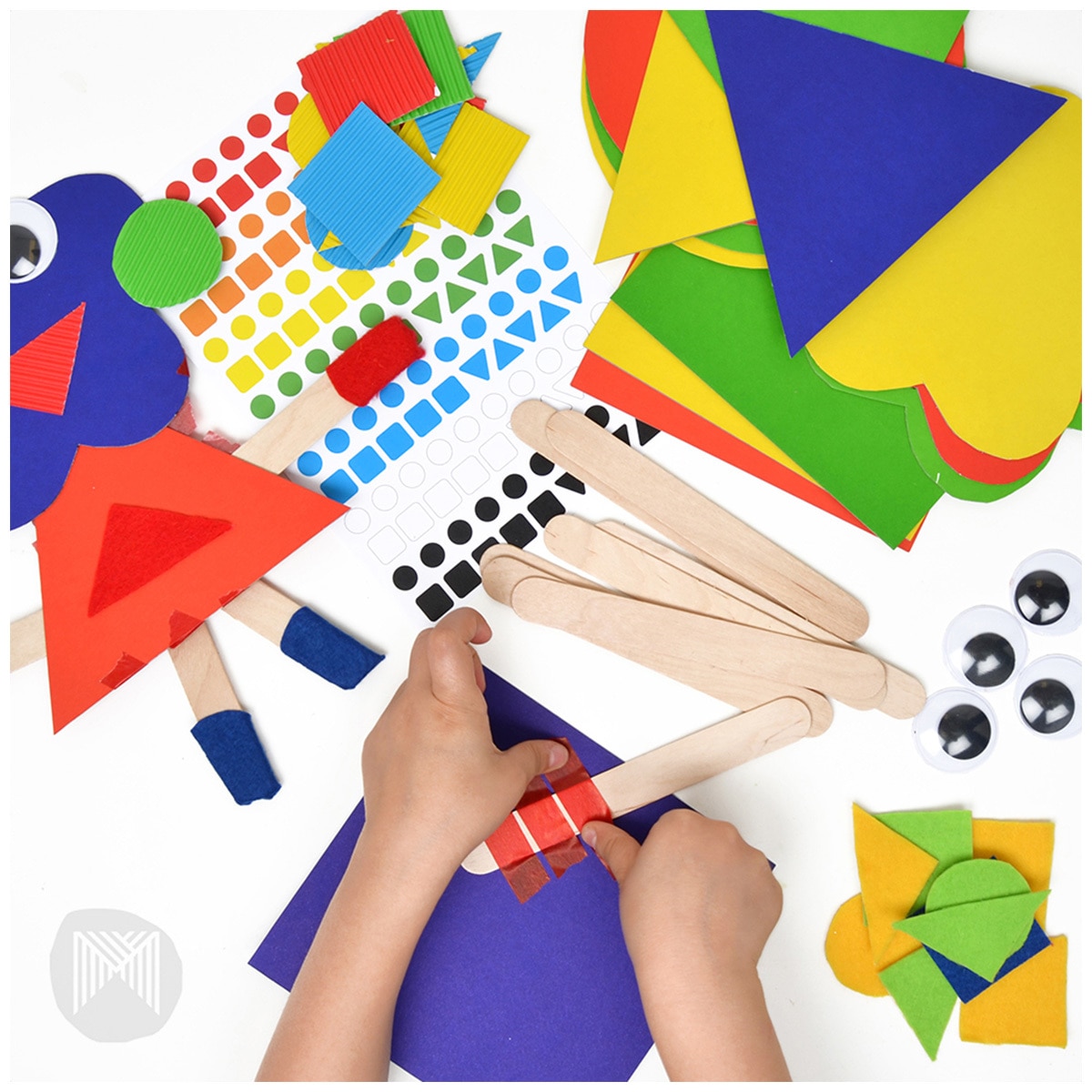 This kit comes with sensory drawing, painting and creating packs. The drawing pack includes six Softie tri-grip crayons, six egg chalks, 12 different textured pieces of card, one whiteboard and a blackboard. The sensory pack has four tubs of creamy no-drip paint, four sheets of bumpy bubble wrap, two rough silver glitter cards, four corrugated white cards, two shiny silver cards and one whiteboard. The creating pack contains four hard circle cards, four tough triangle cards, four stiff square cards, four thick flower cards, one sticker sheet, 12 flat jumbo sticks, and a smooth roll of paper tape. It also comes with self-adhesive accessories: 10 shiny googly eyes, 16 soft felt shapes, and 16 bumpy corrugated shapes.