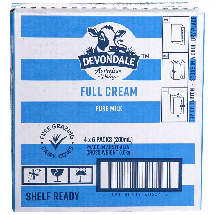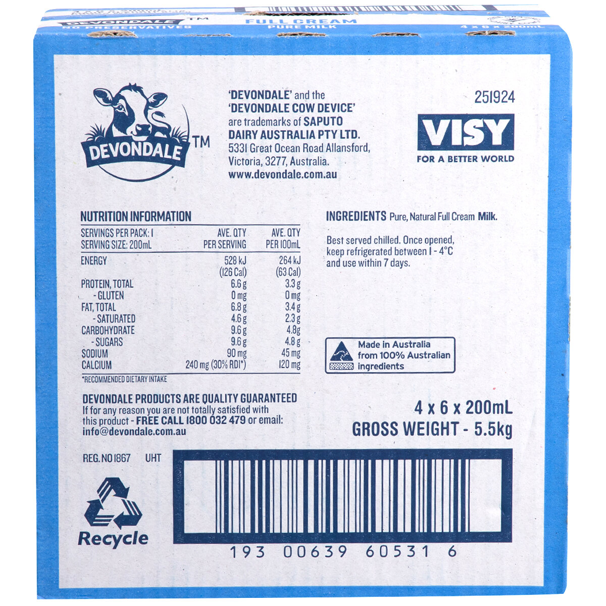 Devondale Full Cream Long Life Milk 24 x 200 ml.