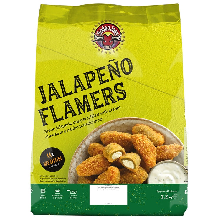 Rodeo Joe's Jalapeno Flamers. Green Jalapeno peppers, filled with cream cheese in a nacho breadcrumb. Ensure product is piping hot before consumption. Once opened, keep frozen and use within 3 months. Suitable for Lacto-ovo Vegetarians.