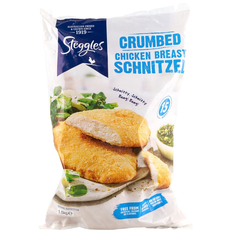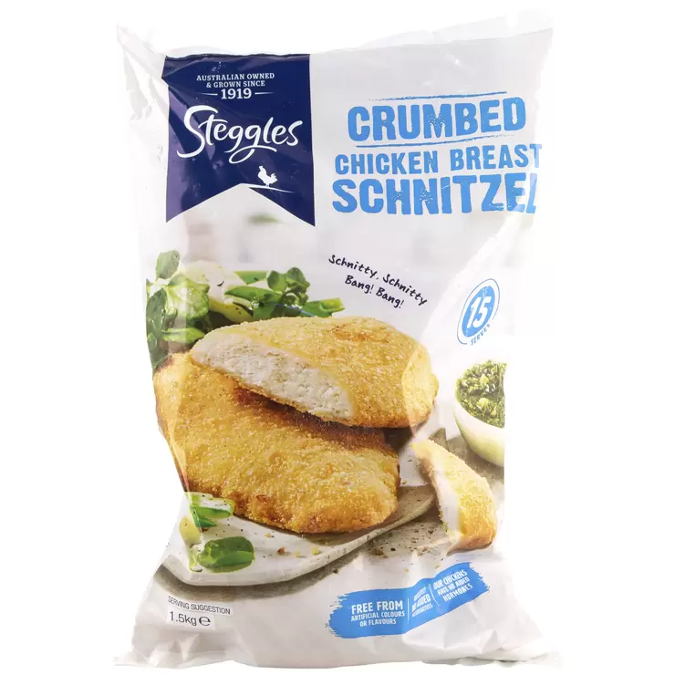 Steggles Chicken Breast Schnitzel Crumbed contains no artificial colours or flavours and no added preservatives.