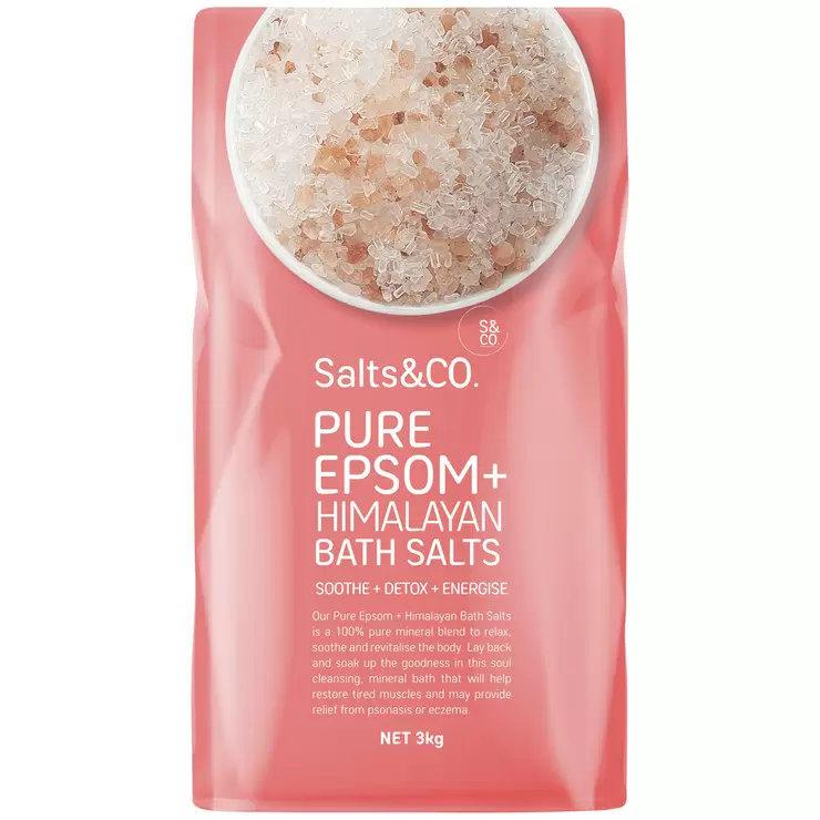Salts & Co Pure Epsom and Himalayan Bath Salts. Pure Epsom and Himalayan Bath Salt is a 100% pure mineral blend to relax, soothe and revitalise the body. Lay back and soak up the goodness in this soul cleansing, mineral bath that will help restore tired muscles and may provide relief from psoriasis or eczema.
