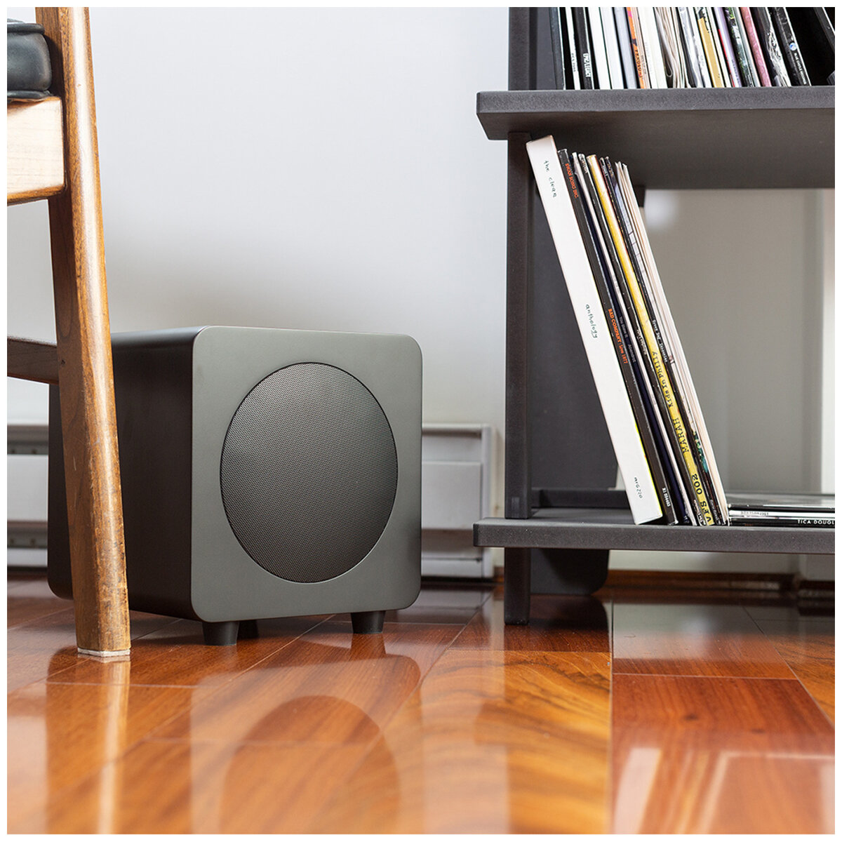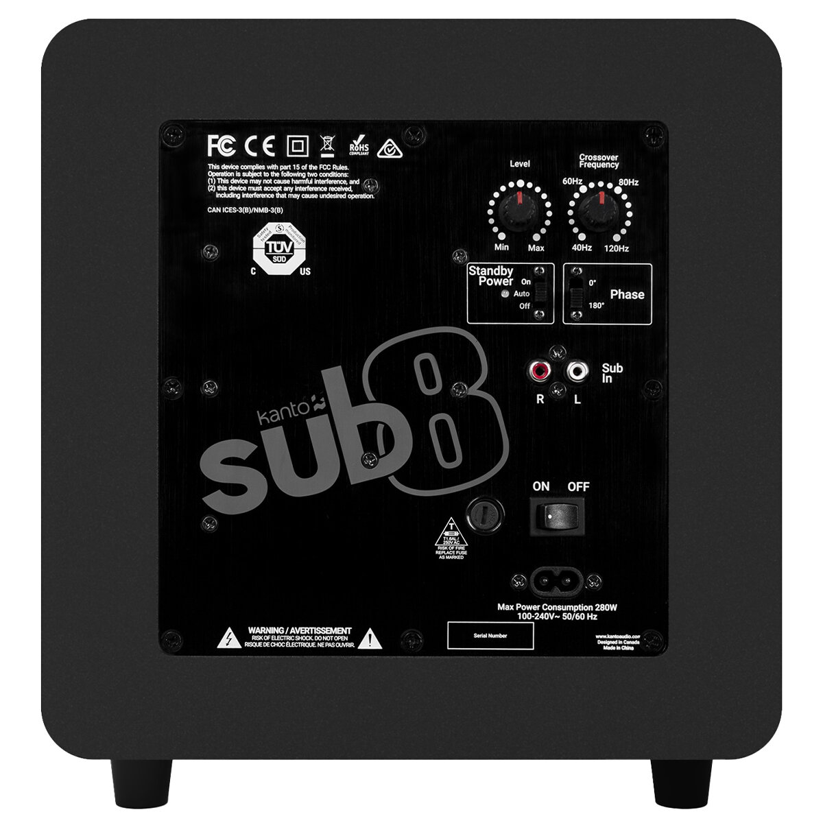 Kanto Sub8 gives you the speed and accuracy that only a sealed subwoofer can deliver. An 8 inch woofer driven by a 300W amp responds quickly to transients and keeps distortion to a minimum. Its compact size provides full range sound without sacrificing floor space and a crossover filter and phase control allow for easy integration into any audio system. Sub8 provides worry free longevity with its rigid MDF construction, solid rubber feet, metal grill and durable vinyl finish. With matching aesthetics, Sub8 is the perfect companion to any Kanto speaker or wherever else tight bass in a tight space is needed.Sealed Enclosure