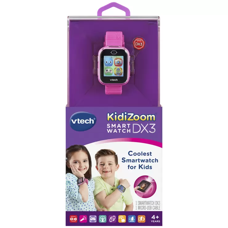 The KidiZoom Smartwatch DX3 with dual cameras captures everything from selfies to action packed videos. Play games and practice telling time with customisable clock faces.