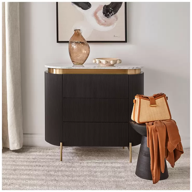An embodiment of modern craftsmanship, the Demarco chest of drawers in black exudes sophisticated allure. Showcasing a ribbed texture and sleek brass accents, this stunning piece is topped with a gracefully curved white Carrara marble top. Its three spacious drawers offer generous storage, combining functionality with aesthetic elegance. Supported by streamlined brass legs, the Demarco chest of drawers delivers timeless style and effortless glamour to any bedroom or living space.Marble is a natural material so each piece is as individual as you are. Its beauty is unparalleled. Variations in colour, markings and veining are expected.