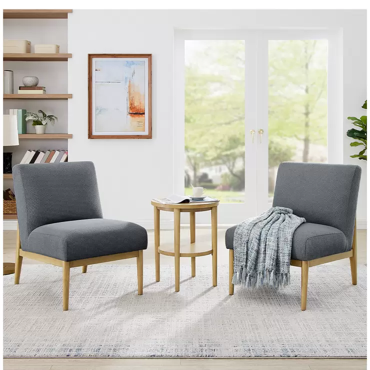 Introducing a touch of sophistication with the Thomasville Fabric Accent Chairs and Side Table Set. Designed to seamlessly blend into any décor, this set brings a refreshing simplicity that lights up any room. Featuring two sleek, armless chairs upholstered in soft, durable 100% polyester fabric, each piece invites you to sit back and relax in comfort. The chairs boast a smooth back design set atop high tapered legs, offering a modern twist on classic elegance. The accompanying side table, finished in a natural wood, complements the ensemble with its clean, crisp lines. This set not only promises style and comfort but also serves as a functional centerpiece in your living room, bedroom, or cozy nook. Transform your space into a stylish haven with the timeless charm of Thomasville.This product features: