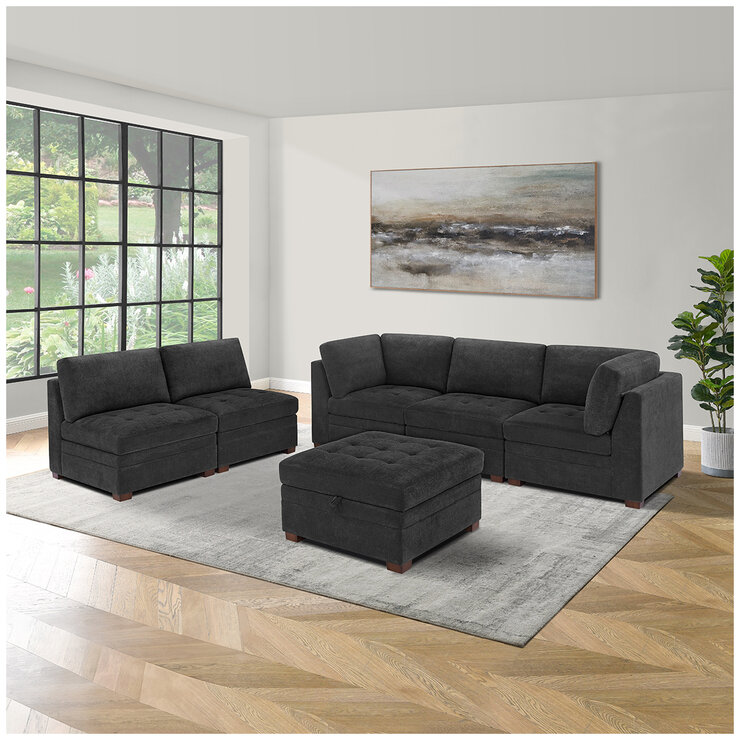 The Thomasville Tisdale Fabric 6 Piece Modular Sectional with Storage Ottoman is perfect for lounging in any indoor living space. This sectional can be arranged in multiple configurations to fit any room, while its soft touch fabric gives it a sophisticated style. The seat cushions are comfortable and yet supportive, thanks to pocket coils and a no sag spring system. The tufting finish on the seat cushions creates an extra touch of style. The solid wood legs feature a rich Walnut Brown finish, completing the look of this beautiful sectional.This product features: