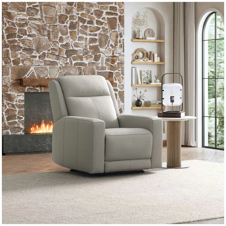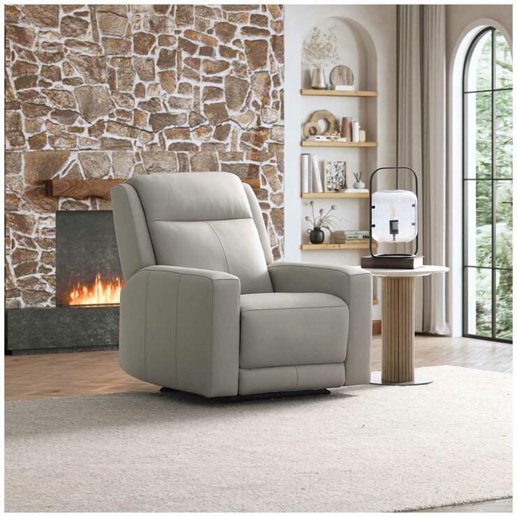 Transform your living space with this sleek leather power recliner. Upholstered in premium top grain leather, this recliner offers a soft yet durable seating that feels as good as it looks. Easily adjust the seat recline to your preferred position with a touch of a button. Built with wide armrests and smooth contemporary lines, this recliner offers both relaxation and style and is sure to become your favourite spot at home.This product features: