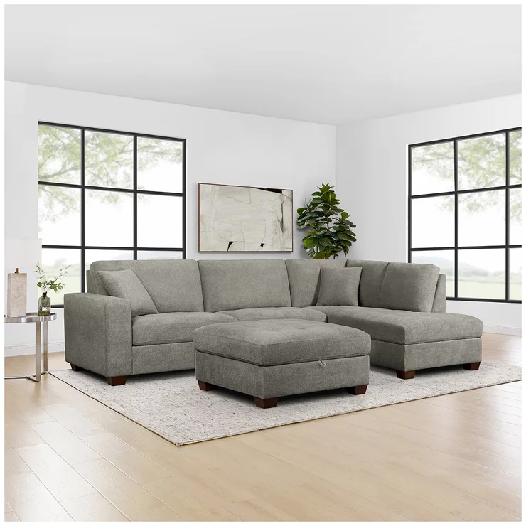 The Thomasville Miles Fabric Sectional With Storage Ottoman adds style to your space and offers quality features in both fabric and construction. The sofa is covered in a soft to the touch fabric and is paired with two accent pillows. A subtle, yet stunning, tuft design is showcased on the seat cushions and ottoman to enhance the overall tailoring and style. The top of the ottoman pulls open to reveal a generous storage compartment. This storage feature allows for blankets, remotes, and more to be stashed out of sight, but still easy to access. Lastly, solid wood legs in a rich walnut brown finish complete the frame.This product features: