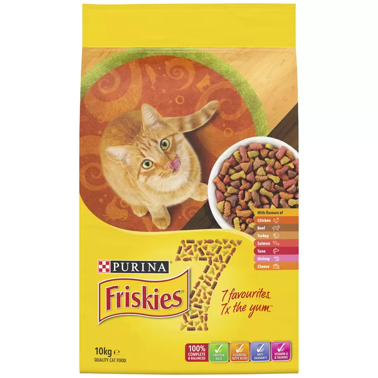 FRISKIES 7 is made up of kibble biscuits in a variety of meat and seafood shapes with the flavours of chicken, beef, turkey, salmon, tuna, shrimp and cheese. 7 of your cat’s favourite flavours for 7 times the yum, it will bowl your cat over. Friskies Dry Cat Food is 100% complete and balanced providing all the nutritional goodness your cat needs to live life to the fullest.