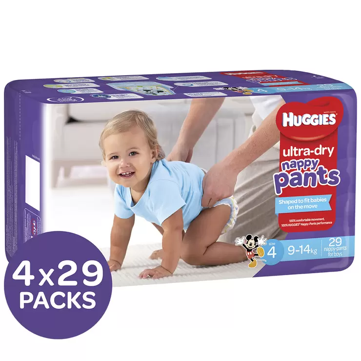 Huggies Ultra Dry Nappy Pants Size 4 9-14 kg Boys 29 Pack are designed to make change time easier whether your active, wriggly baby is laying or standing. A pull-up style pant with a 360 degree soft and stretchy waistband which easily tears open on the sides for easy removal and secure fit. Up to 12 hours leakage protection perfect both as a day and overnight nappy. Soft and breathable waistband and outercover helps baby's bottom stay dry.Tailored absorbency in the front where boys need it the most