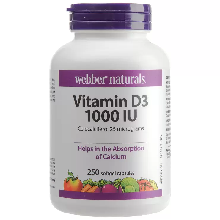 Webber Naturals Vitamin D3 helps in the absorption of calcium and phosphorus, and in the development of teeth and bones. Calcium intake, when combined with sufficient vitamin D3, a healthy diet and regular exercise, may reduce the risk of developing osteoporosis.