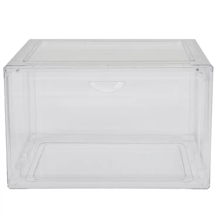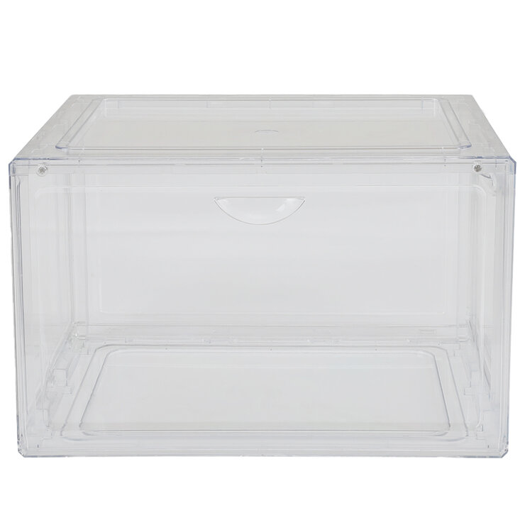 This stackable shoe box (sizes up to US 14), set of 4, with front door and side door access, will not only help you find a home for your shoes, but also allow you to choose which one to wear at a glance and grab it with ease. It is made of PET, our clear shoe boxes are durable for long-term use and protect your shoes from dust and moisture.