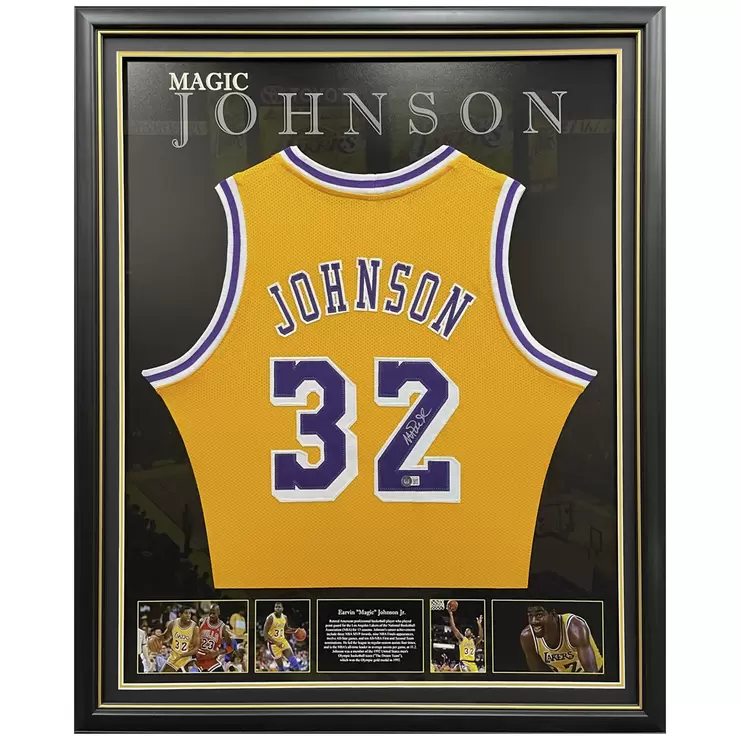 Icons of Sport Magic Johnson Signed LA Lakers Yellow Jersey Framed
