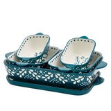 The Voyage 6 Piece Serve Set will add an elegant, modern look to your everyday serving and baking collection. The soft square shape and handles are perfect for any occasion and the blue and white pattern is inspired by floral Aztec designs. Each piece nests together easily for your storing convenience. This set is 100% ceramic stoneware and it is microwave, dishwasher, and oven safe up to 205 degrees Celcius.