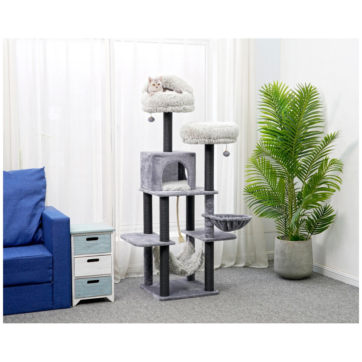 The Catry Bradbury is the perfect playground for your active cat. This 7 level cat tree features a plush hammock and a shag fur hammock to offer your cat extra spaces to rest. Bradbury includes a soft plush cat condo and two shag fur beds to provide your cat with more places to climb and hide. This multi-activity cat tree includes multiple paper rope scratching posts that help in keeping your cat's claws trimmed and healthy as well as providing daily exercise. Bradbury offers a sisal rope and pom pom toys for your cat to enjoy hours of playtime. This lovely grey design will be a great addition to your home décor. All tools and instructions are included for an easy assemble process.