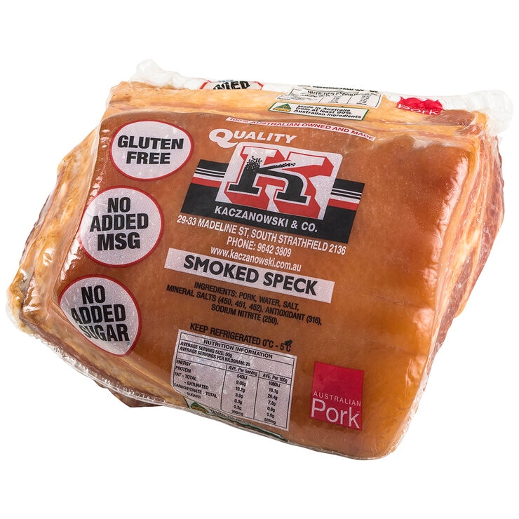 Kaczanowski Smoked Speck is made from 100% Australian pork, cured to Kaczanowski & Co family recipe and smoked over natural smoke. This is the Pork belly with rind on, made in Austalia from 99.0% Australian ingredients. This is a great product to dice and fry for meal flavourings in pastas, casseroles etc.