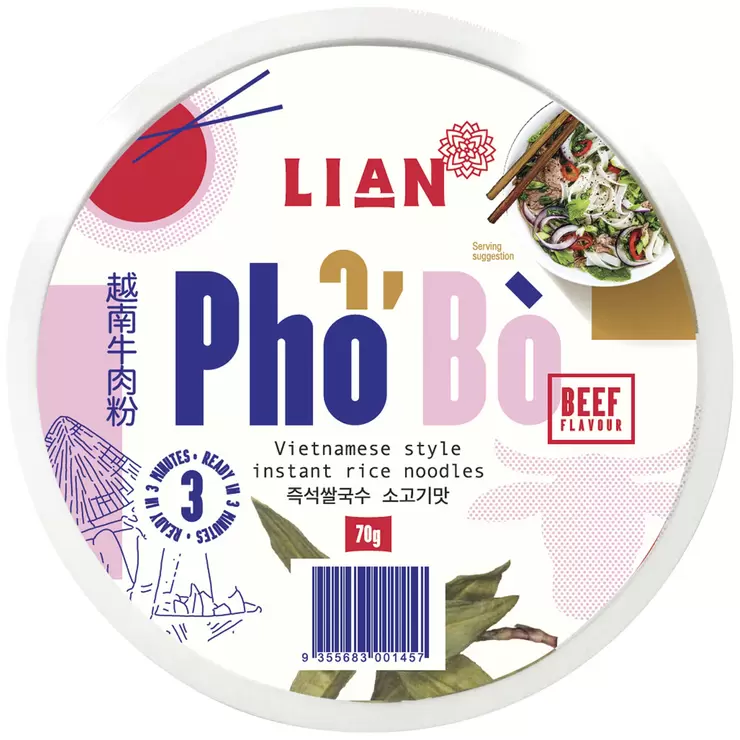 Rice noodles(77.5%):rice, modified tapioca starch(e1404),sugar, flavour enhancer: monosodium glutamate(e621), stabiliser: guar gum(e412), soup base pack: salt, flavour enhancers: monosodium glutamate(e621) , disodium 5’ - guanylate (e631), disodium 5’ - inosinate(e631), sugar, artificial beef flavour, maltodextrin, red shallot, pepper, pho spices(cinnamon, clove, anise), natural colour: plain caramel (e150a) ,anti-caking agent: silicon dioxide(e551), chilli sauce pack: water, chilli, sugar, garlic, salt, tomato paste, modified corn starch(e1422),acidity regulators: acetic acid(e260), citric acid(e330),preservative: potassium sorbate(e202),oil pack: palm oil, red shallot ,artificial beef flavour, pho spices (cinnamon, clove, anise),chilli, natural colour: carotenes(e160a),antioxidant: mixed tocopherols concentrate(e306),dried vegetable pack: textured wheat gluten, green onion, long coriander.