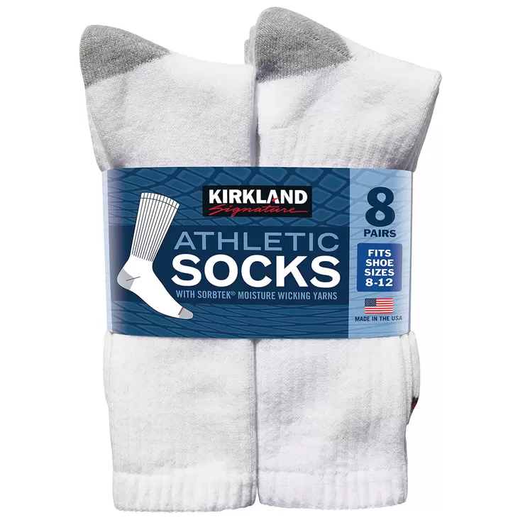 These Kirkland Signature men's athletic socks will keep you comfortable during sport. They feature Sorbtek moisture wicking yarn and are fully cushioned from top to bottom with a reinforced heel and toe. They also have a longer cuff with a smooth toe seam, and they're vented for breathability.