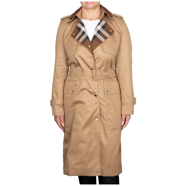 The Burberry Sandridge trench coat is a classic coat which features the iconic check on the collar and includes a buckle belt. This coat is a constructed woven with no stretch for a more tailored fit.