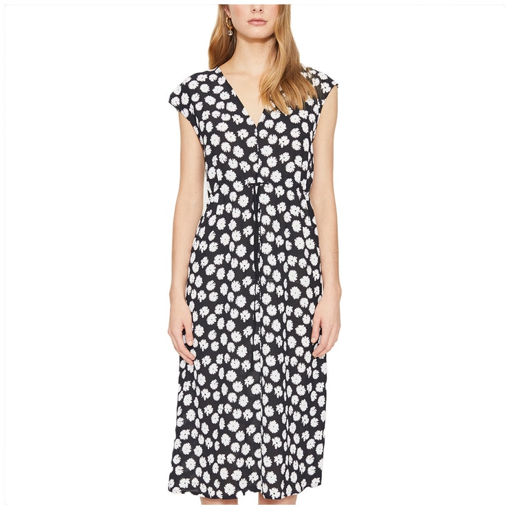 This flowy dress is ideal for warmer weather with sleeveless arms, a V-neck neckline and a cord tie at the waist. The midi length and relaxed fit pair well with sneakers for a complete outfit.