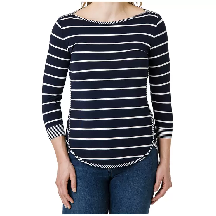 This Segments women's 3/4 sleeve top is soft and comfortable with a boat neck and contrasting stripe trim for a modern, tailored look. It also features a rounded hem, 3/4 sleeves, and it's pre-shrunk to minimise shrinkage.