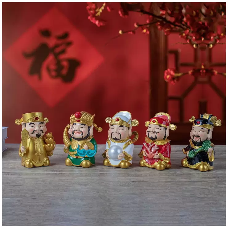 This five God of Wealth decoration set is inspired by traditional God of Wealth legends, with each figure boasting its unique character. Crafted from durable polyresin and featuring exquisite hand painted details, they are perfect for gifting or decorating your own space. Let these five adorable Gods of Wealth bring abundant fortune to you and your family.This product features: