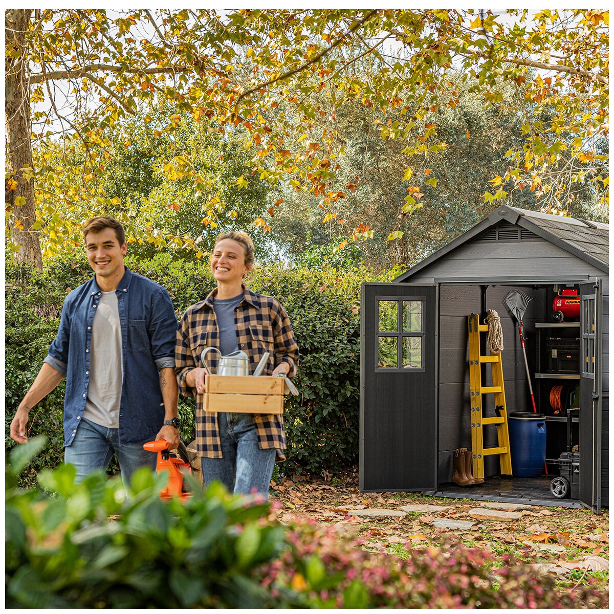 If your garage is looking a little crowded with pool toys, patio furniture and gardening equipment, it might be time for a change. Take your garage back with the Newton storage shed. This spacious storage shed features windows and a skylight. So there’s great ventilation and natural light. It has a beautiful wood like appearance but it won’t rot peel or rust over time. It will continue looking great and help you keep your garage clean enough to fit all your cars in their intended spaces.
