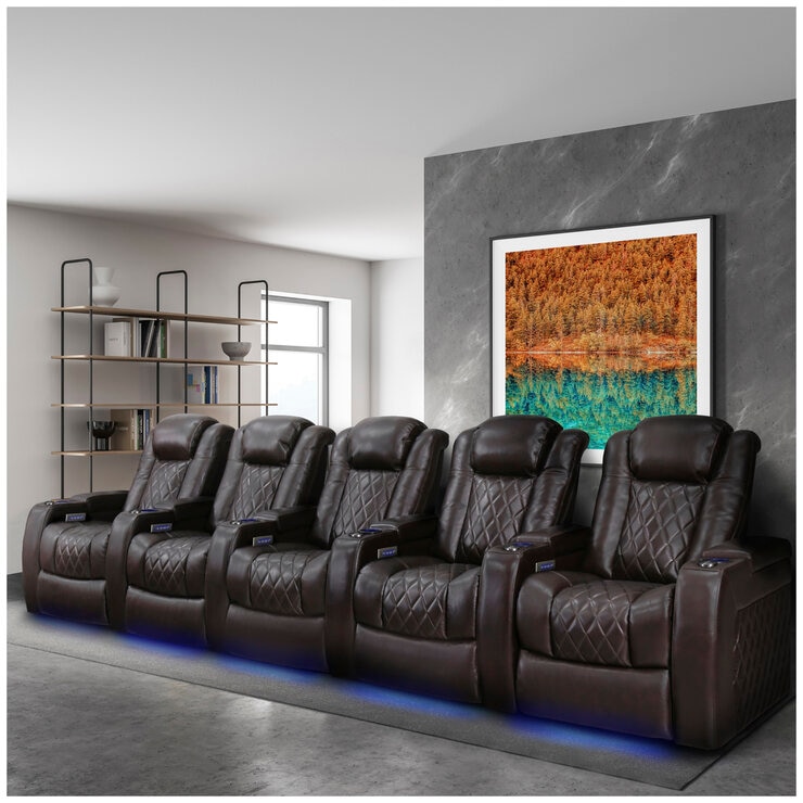 Take control of your comfort with mechanical controls inside the armrest. The controls also have a USB port so you can charge all of your devices while enjoying pure luxury. LED cup holders allow you to easily find where you drink is, even in the darkest environment. They can be toggled on and off using the center circle control button to ensure you have an immersive movie experience. LED ambient base lighting creates a truly luxurious cinema environment in your home theatre.