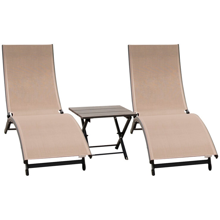 Acrylic mesh wraps the loungers making cleanup virtually nonexistent. Three piece set turns your outdoor world from lackluster to luscious in one step. Full recline makes sleeping in your bed lose its appeal. Neutral colour makes mixing and matching a snap. Acrylic mesh seat and rust free Aluminum frame settle this lounger firmly into the weather resistant category. Includes a 12 month manufacturer's warranty.