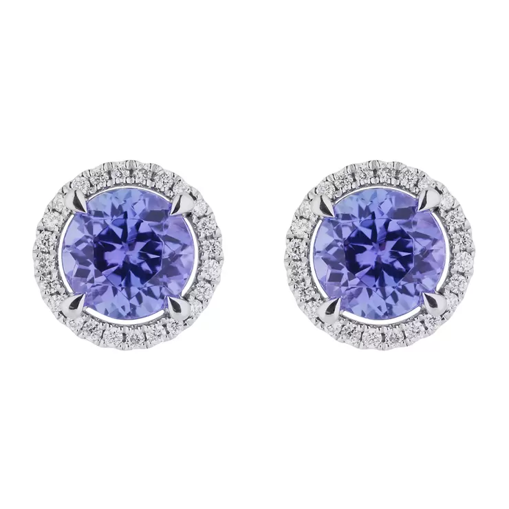 Bring a sense of style and elegance to any event, party or occasion with this beautifully designed piece. These Tanzanite and Diamond earrings feature a round 1.30ctw Tanzanite centre stone with Diamond halo set in 18KT White Gold.