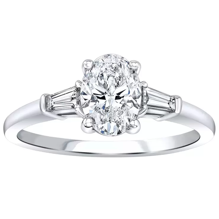 This charming engagement ring is crafted in 18K white gold features a oval diamond center, weighing in 1.00ctw. With two illuminating tapered baguetes weighing in 0.18ctw, one on each side, that creates a flattering finish look for any special occasion. Finger size 7, can be sized one size up and/or down.| Metal | 18KT White Gold |
