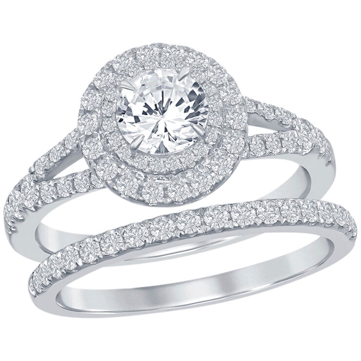 Double halo 18kt white gold 1.46ctw diamond ring set.
