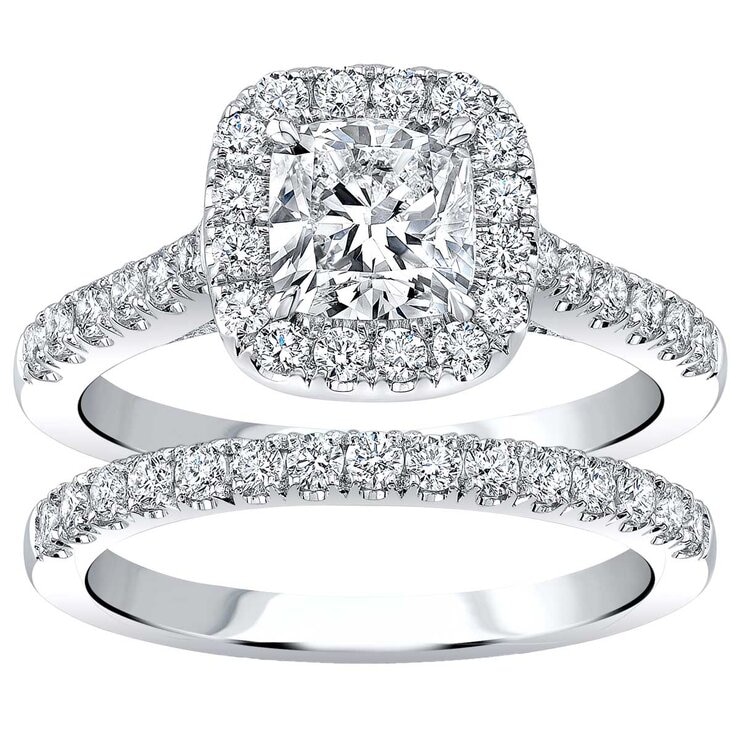An opulent engagement and wedding ring set, exquisitely rendered in mirror finished 18 karat white gold. The engagement ring features a cushion shape brilliant cut diamond weighing 1.00 carat and completing the engagement ring and matching band are 81 round brilliant cut diamonds with a combined weight of 1.00 carat. The diamonds average VS clarity, “I” color range, with very good finish and proportions. The finger size is 7 and sizing allowance is possible.| Metal | 18KT White Gold |