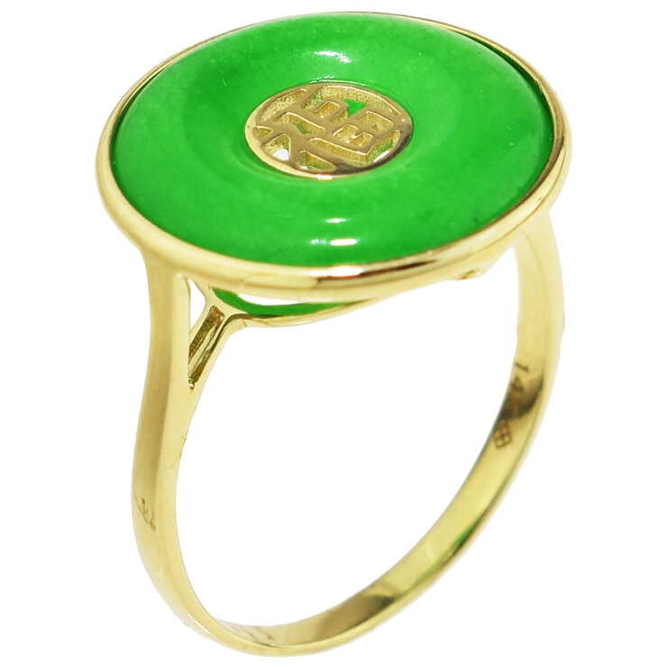 14KT Yellow Gold Dyed Green Jade Good Luck Ring 15mm