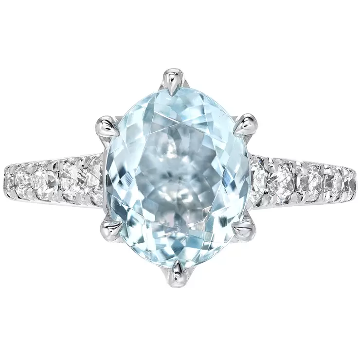 This oval aquamarine ring features a row of 0.48ctw round brilliant cut diamonds, all set in 18KT white gold on either side of the stunning centrepiece stone.