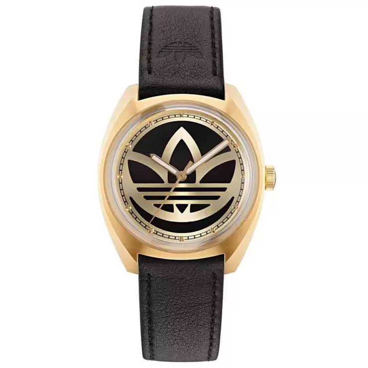 This Adidas Edition One watch is a sleek watch with innovative design. The black dial has a bold cut-through gold tone Trefoil logo at the centre, on a sleek gold tone stainless steel case with a domed lens and a black leather strap.| Gender | Unisex |