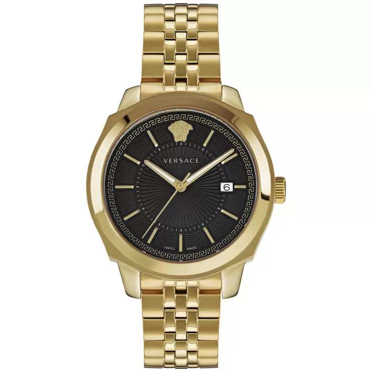 Versace Icon classic men’s watch 42 mm IP yellow gold case black Guilloché dial stainless steel bracelet.