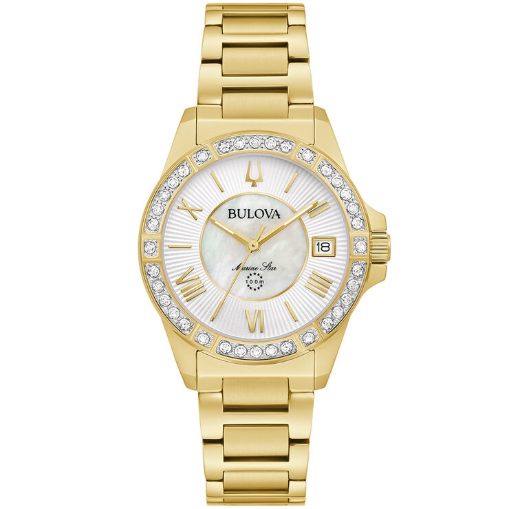 From the Marine Star collection, get swept away in the effortless elegance of this richly detailed women’s timepiece with a gold tone stainless steel case and bracelet. The case features 24 individually hand set diamonds on a gold tone bezel and is finished with a sapphire crystal and a white mother-of-pearl dial. Also featuring a deployant clasp closure and water resistance to 100 metres, this must have watch keeps perfect time while channelling a timeless glamour.