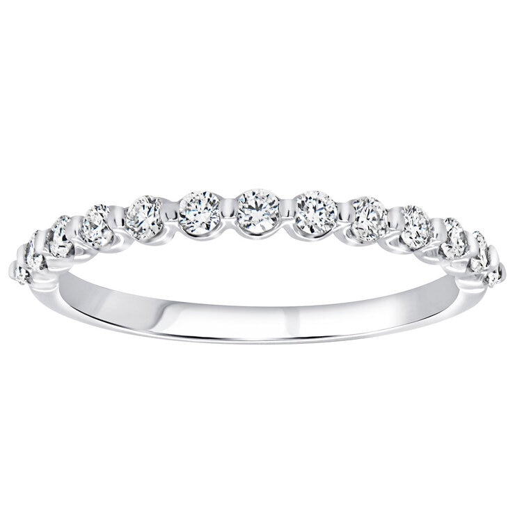 Embrace the eternal sparkle of love with this enchanting single row diamond band, adorned with 13 round stones totaling 0.37ctw, set delicately in the embrace of lustrous 18KT white gold, a timeless symbol of enduring romance and everlasting commitment.