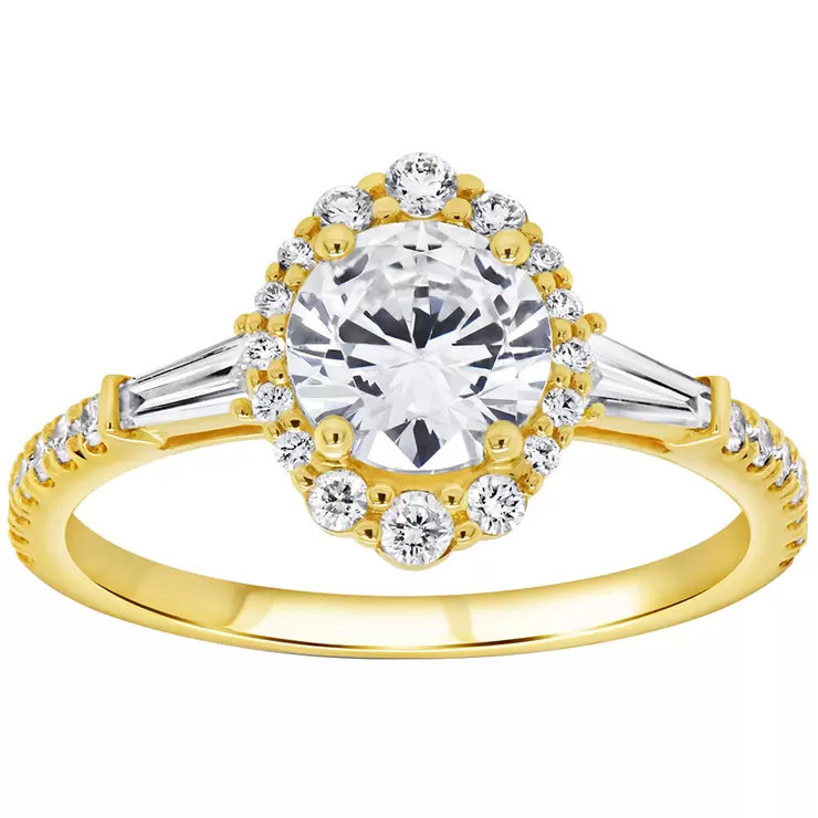 An elegant engagement ring presented in an 18KT yellow gold mirror finished setting, the centre top features a round brilliant cut diamond weighing 1.00 carat and contrasting this are 33 assorted baguette and round brilliant cut diamonds with a combined weight of 0.45 carat. The diamonds average VS clarity with an I colour range, very good finish and proportions.| Metal | 18KT Yellow Gold |