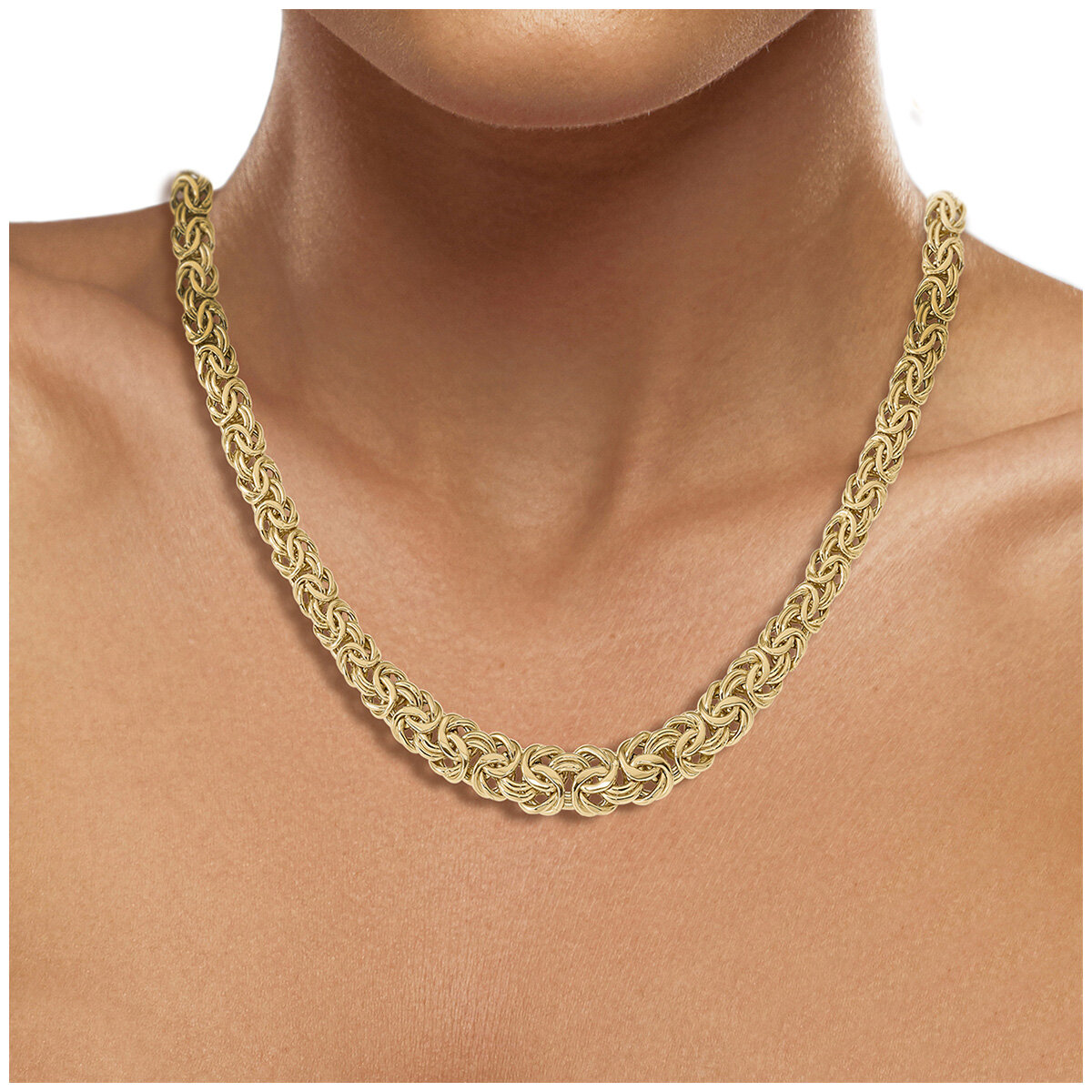 18KT yellow gold polished graduating byzantine chain. Chain is 10.5 mm to 7.5 mm wide and 4.25 mm to 3.3 mm thick, the clasp is 11 mm round and 2.4 mm thick.| Metal | 18KT Yellow Gold |
