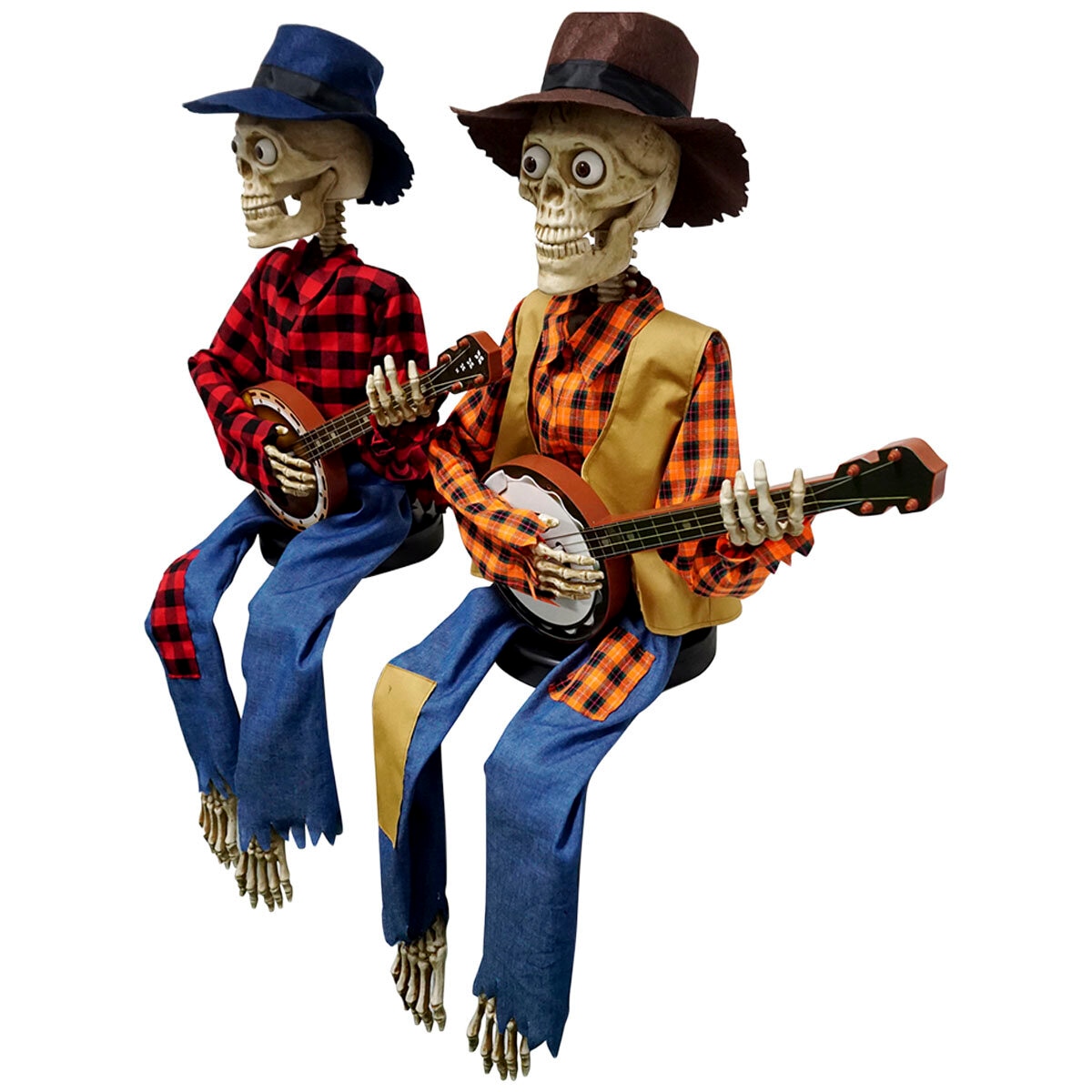 These animated banjo skeletons are the ideal addition to your Halloween decor. They strum their banjos, play music, speak in English, French and Spanish, their heads turn, and their eyes light up. They play three songs including "Duelling Banjos" and "William Tell Overture", and they have volume control and motion and sound sensors. They're also interconnected with a heavy duty 2.2m cable and need to be displayed on a flat surface, but the long cord allows them to be displayed at different levels. No assembly needed, simply plug and play with the included adapter. This is not a toy.