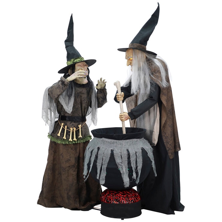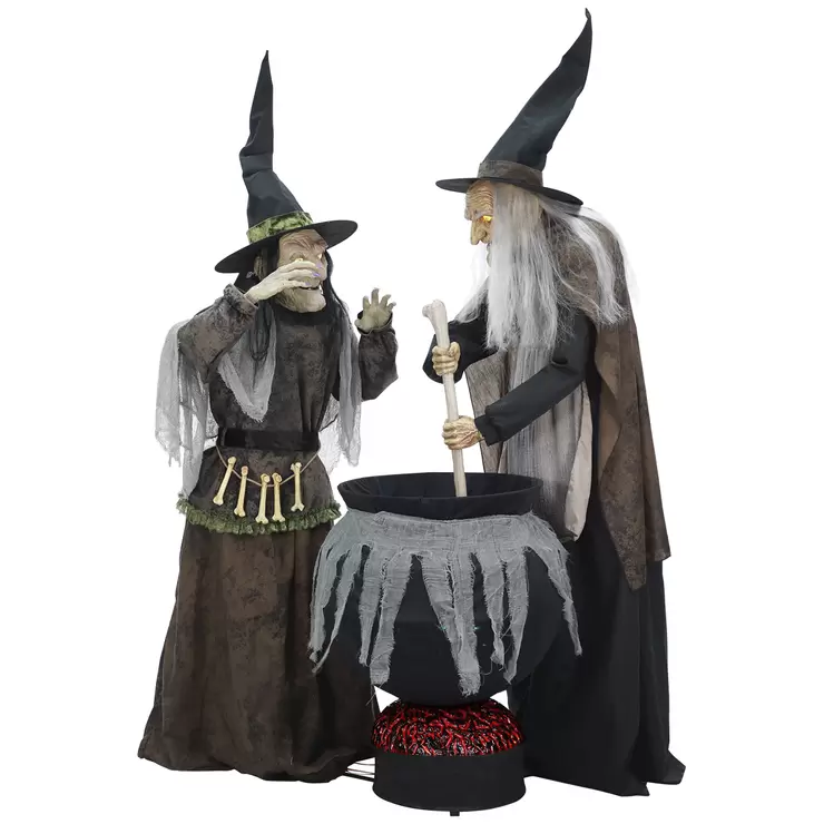 This 1.52 metre tall Witch Cauldron Duo takes on the night looking for those foolish enough to drink their potions. Their turning Torsos and moving jaw give them show stopping movement. In the dark you can see how powerful the Witch Cauldron Duo are with their glowing LED eyes, doing their best to summon the darkness. If you listen up too close, you'll find yourself under their spell and an ingredient for their magical cauldron.