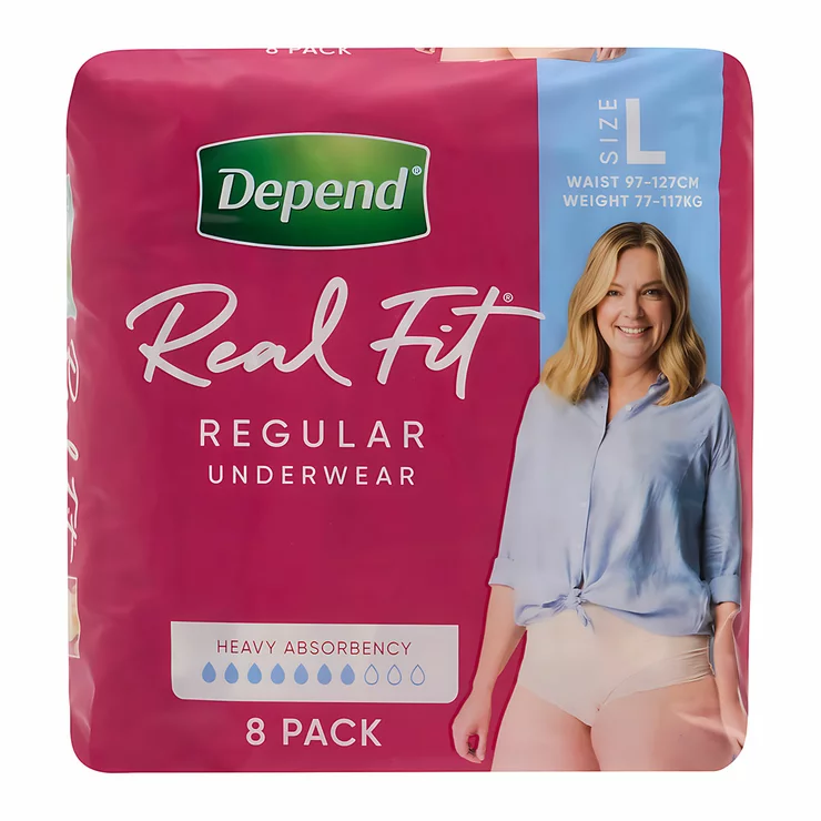 Depend Real-Fit disposable underwear for women is specifically designed to fit and feel like real underwear while offering protection against heavy loss of bladder control. It is soft, discreet and comfortable to wear.3-in-1 protection offers worry-free odour control, fast absorption and a discreet, comfortable fit. Depend Real Fit Underwear for Women is specifically designed to fit and feel like real underwear and protect against heavy bladder loss with all-around leg elastics for leakage protection.