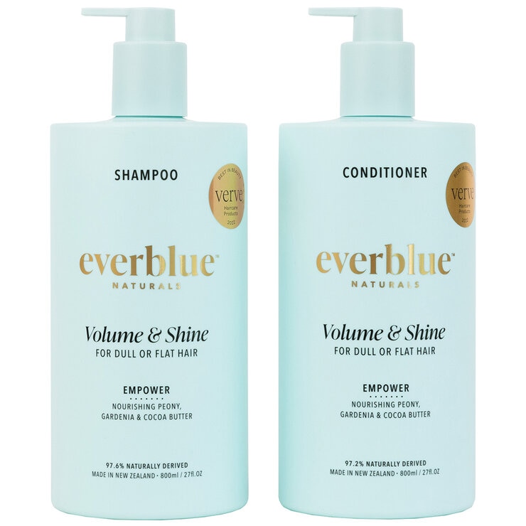 Say hello to bounce and glossy strands with this award winning Everblue Volume and Shine Shampoo and Conditioner set. This supersized duo is enriched with nourishing Peony, Gardenia and Cocoa Butter to add body, and rejuvenate Flat, Oily or Fine Hair. Sweet Almond Oil, Cocoa Butter and hydrating Aloe Vera nourish, while Keracyn (Artichoke) and Wheat Protein provide protection against free radicals, while also boosting volume. Peony Extract and Ylang Ylang Oil rebalance the scalp for fuller, healthier hair naturally.The product features: