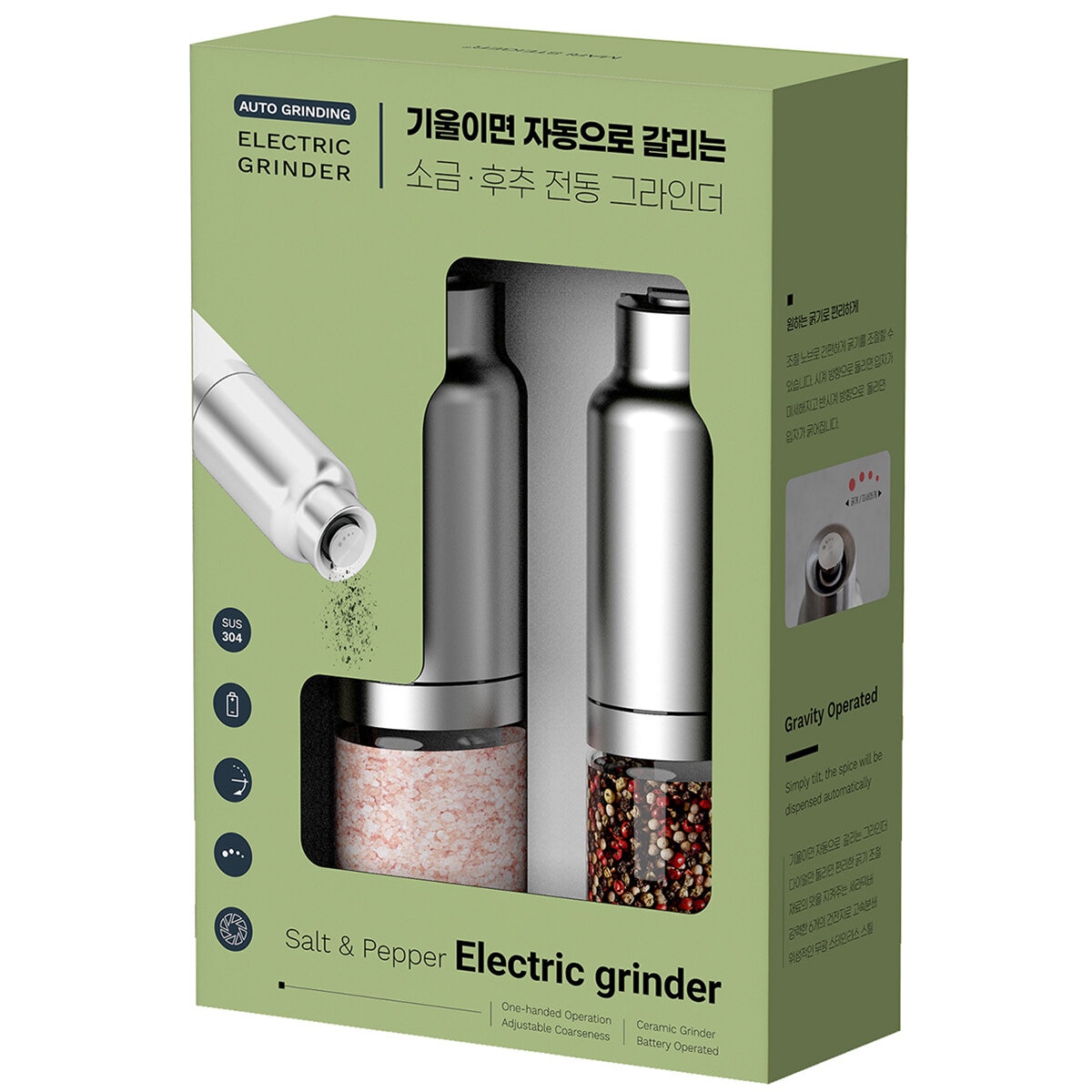 Effortlessly dispense spices with this gravity activated salt and pepper electric grinder. Simply tilt to start grinding and return upright to stop. Adjust the grind size from fine to coarse with an easy to use knob. The clear glass container is easy to refill and lets you monitor the content level. Featuring a corrosion resistant ceramic grinding core, it is perfect for both pepper and salt. Make seasoning a breeze with this stylish and practical kitchen tool.This product features: