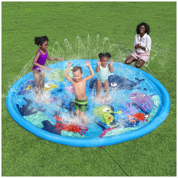 The H2OGO! Underwater Adventure Sprinkler Pad is redefining backyard fun. Big and little kids alike will love the shallow splash pool created with the inflatable rim that surrounds the pad and traps the water for skipping, splashing fun. Get ready to dance beneath a cascade of cool water! Just hook up your garden hose to create the gentle streams that will not only inspire play and imagination but keep everyone cool under the warm summer sun. Kids can jump, splash or wade in the water. Plus, kids will be captivated by the friendly ocean themed graphics and parents will enjoy the easy set-up and safe water play. Everyone will find something to enjoy with Underwater Adventure Sprinkler Pad.The product features: